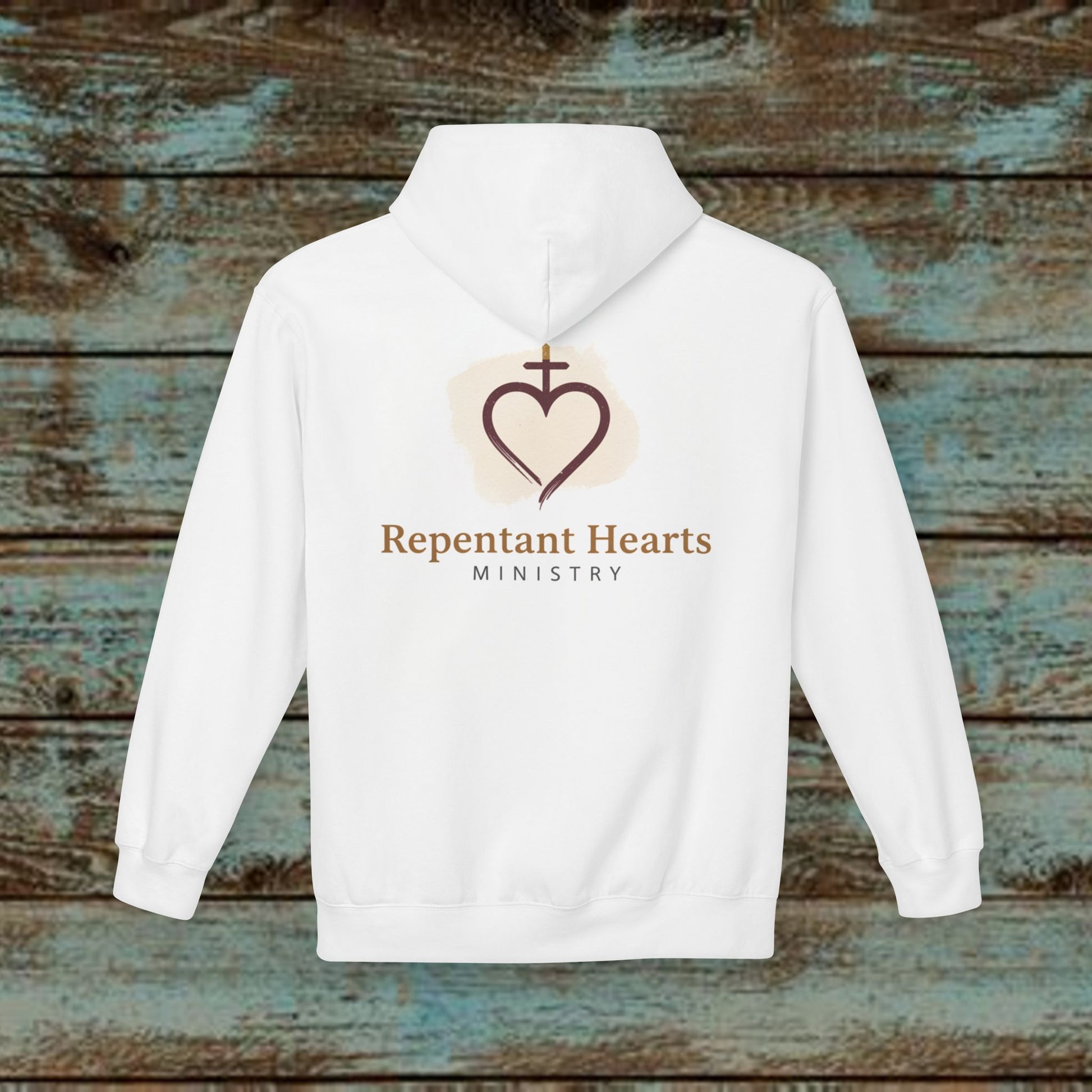 A softly structured hoodie that carries quiet faith and calm dignity. Lightweight but warm, its clean white canvas showcases a gentle, hand-drawn heart-and-cross emblem in warm beige and coffee tones, with "Repentant Hearts Ministry" subtly lettered above and below. The dropped shoulders and pouch pocket create a relaxed, approachable silhouette — something worn during reflective mornings, volunteer runs, or small-group worship. Breathable ring‑spun cotton with a soft fleece interior keeps the wearer comfortable without feeling bulky. The label-free neckline and socially conscious certifications speak to thoughtful values behind the garment, letting the message take center stage while honoring ethical production.